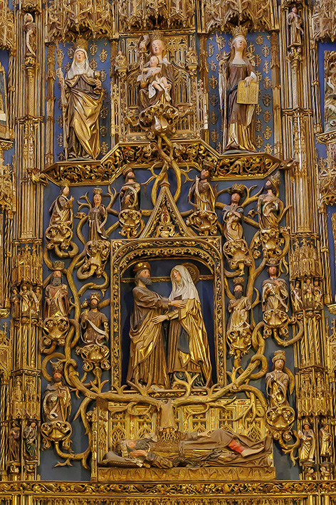 Foto: Jaap van Werkhoven, Altaarstuk in de kapel van Sint Anna in de kathedraal van Burgos (Spanje). Het geeft de stamboom van Jezus weer. Anna is de moeder van Maria. In het midden is zij afgebeeld met haar echtgenoot Joachim. Helemaal onderaan ligt Jesse, de vader van David, te slapen. De oude (stam) boom komt weer tot bloei en komt uiteindelijk uit bij Maria met Jezus in haar armen.